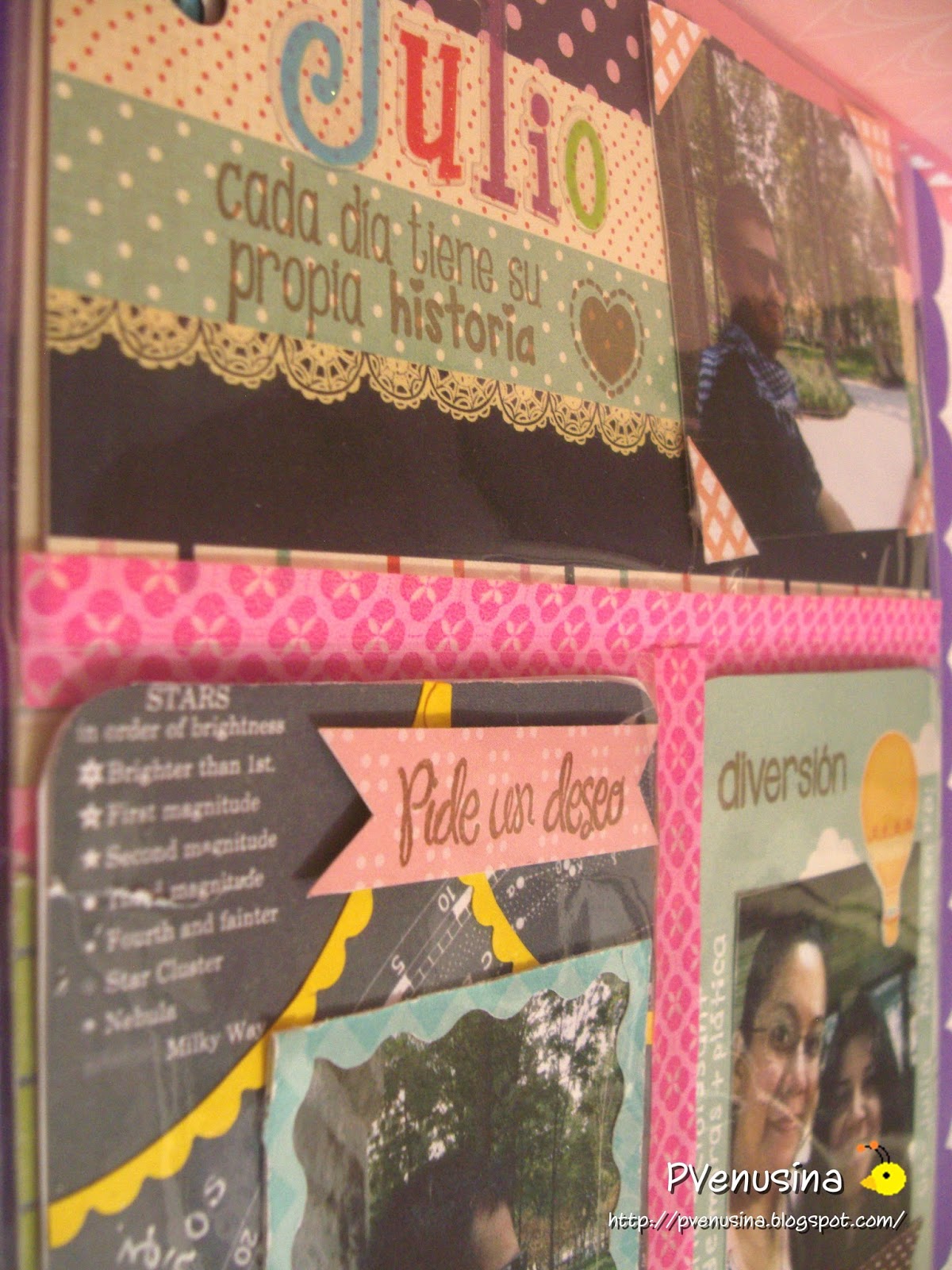 De estas dos páginas sólo una corresponde al Project Life pero les cuento que no quise que la primera quedara en blanco así que decidí escribir una frase y aplicar en las letras una técnica que las chicas de Latinas en América denominan Zentangles. Para decorar apliqué un poco de tinta distress que a final de cuentas fue puro stress, no quedé convencida del resultado así que .... ¿Que tal la segunda página? aquí solucioné mi problema de los bolsillos utilizando bolsas de celofán que dividí con washi tape y cinta doble cara. Las journaling cards venían en una colección de papel y para decorar utilicé sobrantes de papel, sellitos de Latina Crafter y unas letras con glitter regalo de Haideelum.